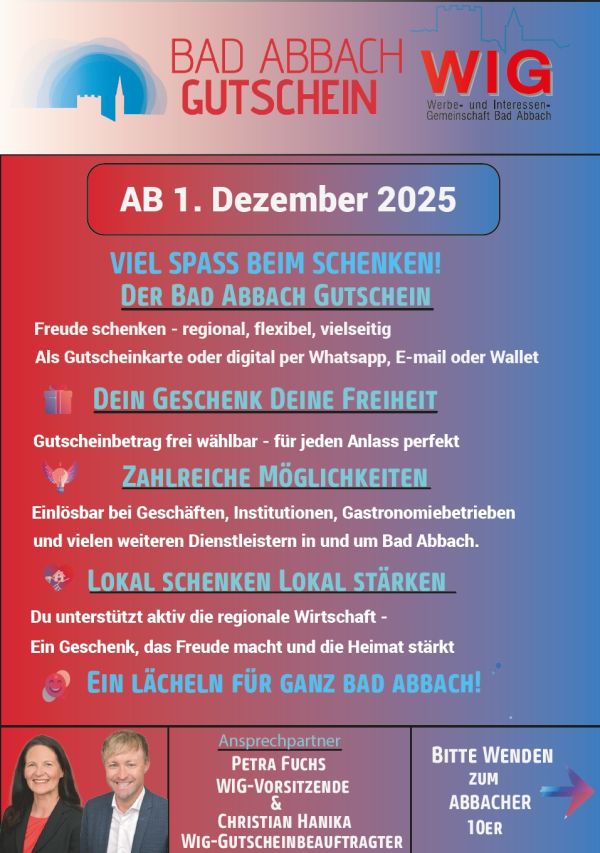 Ab 1. Dezember kann man den neuen Bad Abbach Gutschein z. B. als Weihnachtsgeschenk erwerben. Wie auch beim WIG Bad Abbacher 10er bauen wir weitere Akzeptanzstellen dazu!